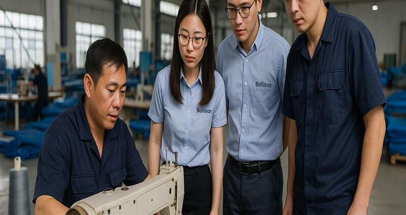 On August 12, 2025, Jinan Bollison held a joint workshop in the company’s workshop, bringing together the Production Director, R&D team members, and experienced sewing operators to research and develop improvements in sewing speed and craftsmanship.