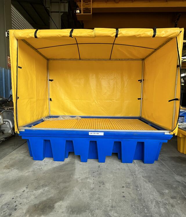 Manufacturer of drum spill pallet frame and cover systems. Designed for secondary containment, weather protection, and compliance in industrial drum storage.